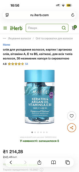 олія для укладання волосся, кертин і арганова олія, вітаміни A, E та B5, кв