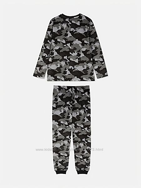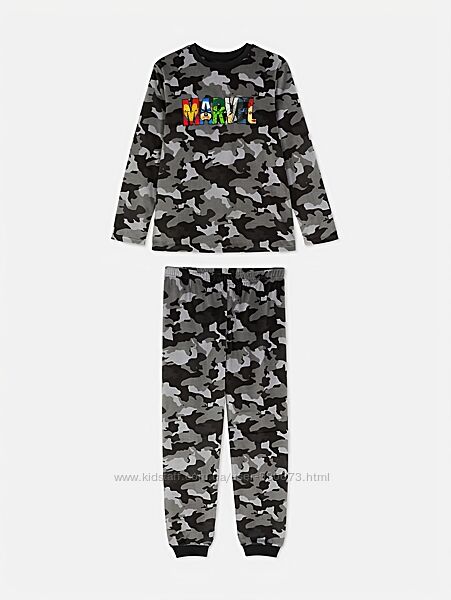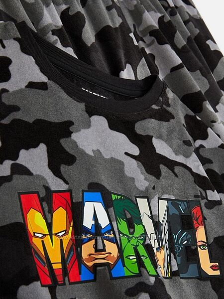 Піжама Marvel для хлопчиків 🖤Затишна піжама з ніжного мікровелюру, який дарує тепло та комфорт у прохолодні ночі.Модний сірий камуфляжний принт і яскравий напис Marvel із зображеннями улюблених героїв додають стилю та настрою.Кофта з довгим рукавом і зручні штани з манжетами забезпечують комфортний сон і відпочинок.