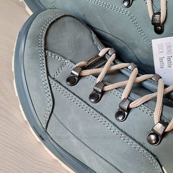 Верх нубук + текстиль Мають мембрану Gore-Tex Носочки та п´ятка захищені Обідочки та язичок - м´якенькі Устілка анатомічна, з бортиками, текстильна Фісуються за допомогою шнурків, на люверсах Серединка текстильна Лямка на задніку для зручного взування БОМБЕЗНА підошва із надійним протектором фірми Vibram Колір м´ятний Виробник Словаччина