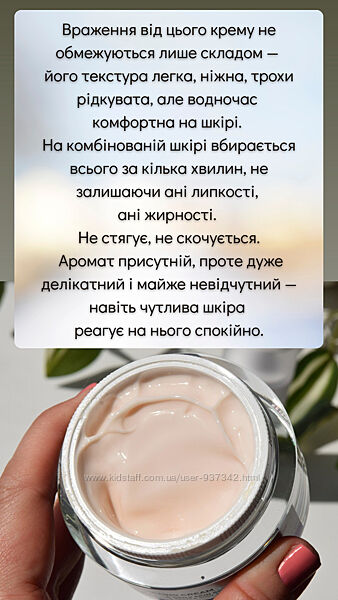 Миттєвий ліфтинг та ущільнення шкіри — крем відновлює тургор, підвищує еластичність і помітно розгладжує мімічні зморшки.