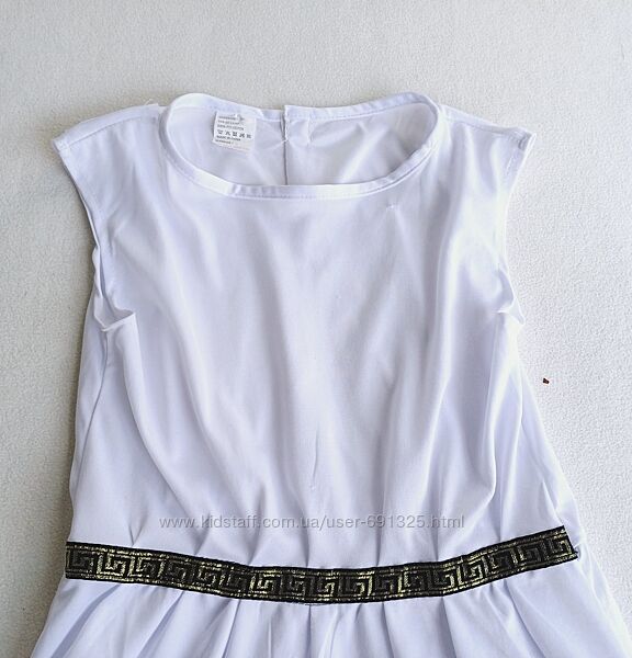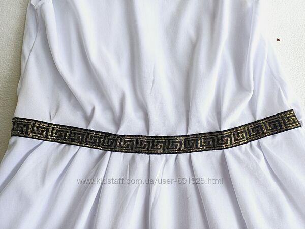 Пропоную карнавальний костюм на тематику Греції. Складається з білої сукні та рожевого палантіну на липучках. Матеріал 100% поліестр, тягнеться. Уживаний 1 раз, стан загалом дуже добрий, але є зачипка та дефект на подолі, дивіться фото.Розмір вказано на 10-12 років, зріст 140-146 см. Довжина 88 см, ширина грудей під пахвами 42+ см.