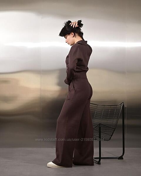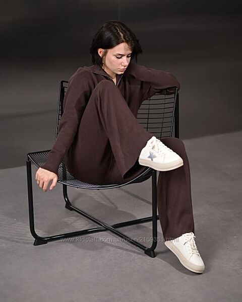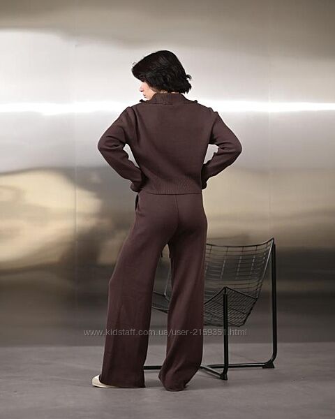 Жіночий в´язаний костюм з м´якої пряжі преміум якості. Комплект складається з вільного светра з коміром і прямих штанів на регульованому поясі. Матеріал приємний до тіла, не колиться, добре тримає форму та не розтягується після прання.Підходить для повсякденного носіння, роботи, прогулянок і вдома. Універсальний базовий відтінок легко комбінується з пальто, курткою, кросівками або ботильйонами.