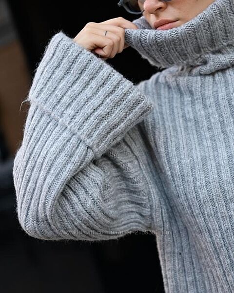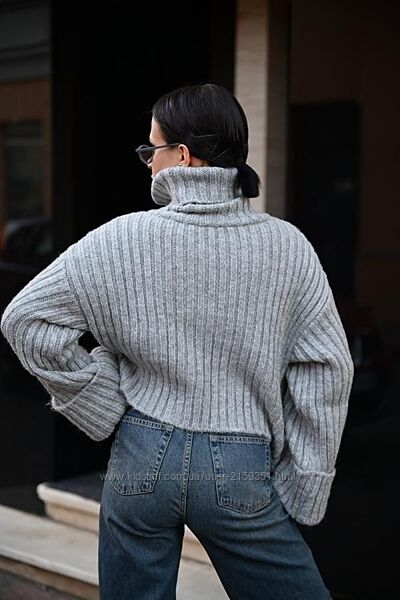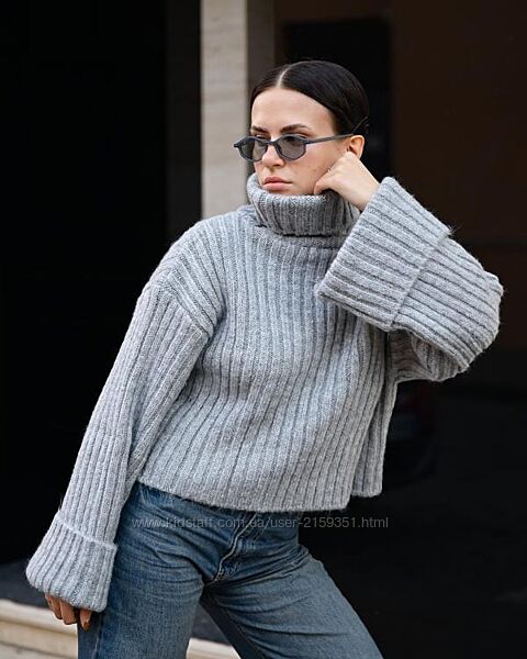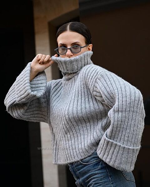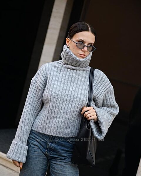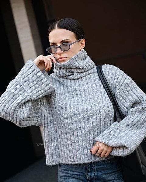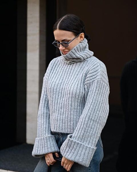 Об’ємна в’язка, укорочений крій і акцентні широкі рукава створюють сучасний силует у стилі soft minimalism.
