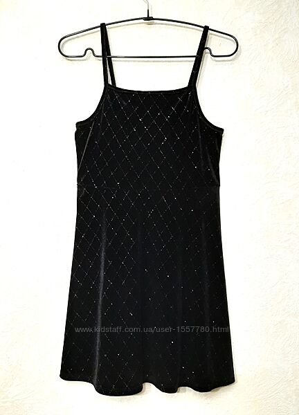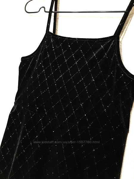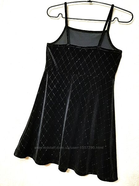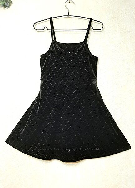 Брендова гарна святкова сукня чорна велюрова на тонких бретельках, без рукавів, відрізний верх, коротке, розширене донизу, сріблястий блиск.Бренд Primark. Маркування розміру 10-11років. Йде на вік 10-11-12рок. Порівнюйте по вимірам.
