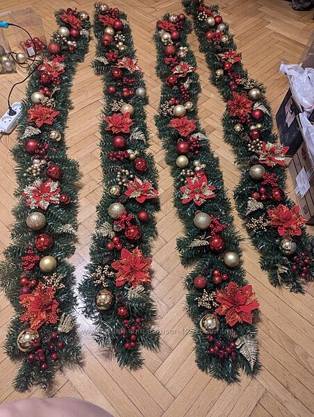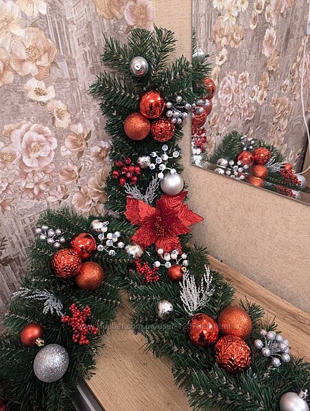 Подробное описание: Різдвяний декор, хвойна прикрашена гірлянда , ялинка на камін, стіну, вітрину, в
