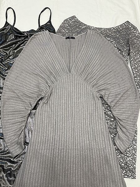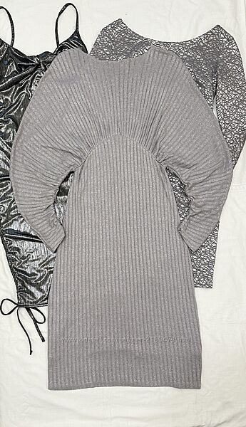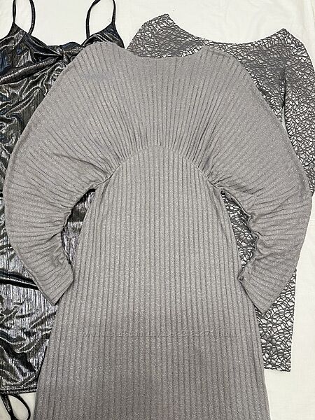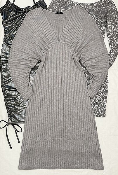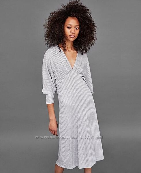 Подробное описание: Срібна трикотажна сукня міді Zara з V-подібним вирізом і драпіруванням