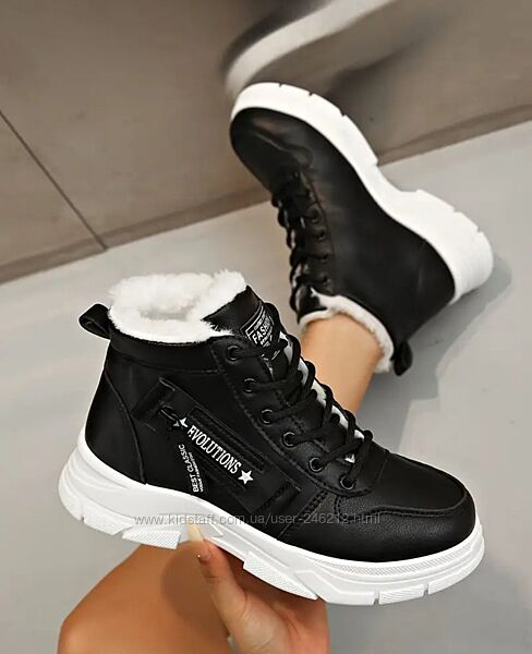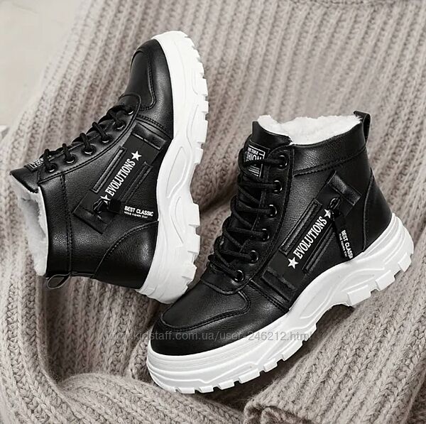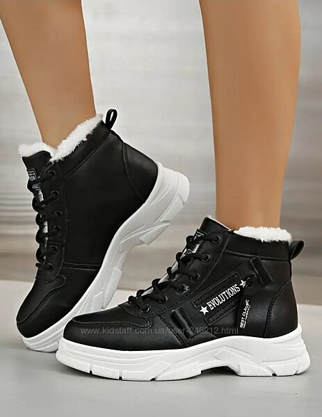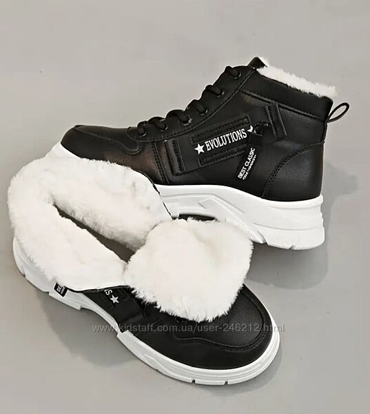 Чудові кросівки , на хутрі CNSN ( Кітай).Чорні зимові черевики з білою підошвою та білим хутряним оздобленням, що мають напис "Evolutions" на ремінці.