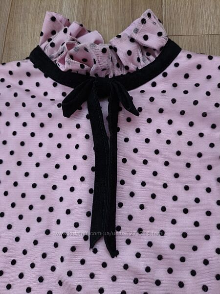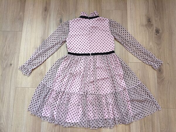 Святкова сукня з довгим рукавом.Зверху ніжно-рожевий фатін в чорний горошок, підкладка - атласна ніжно-рожевого кольору.