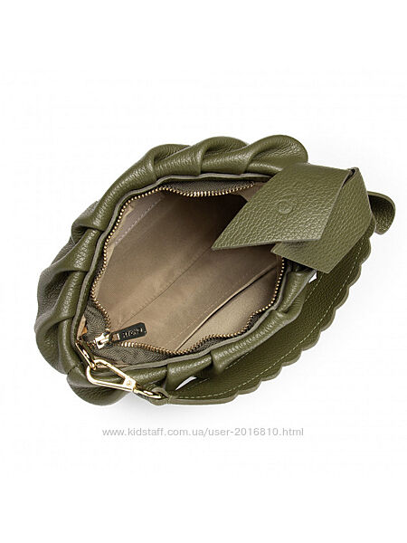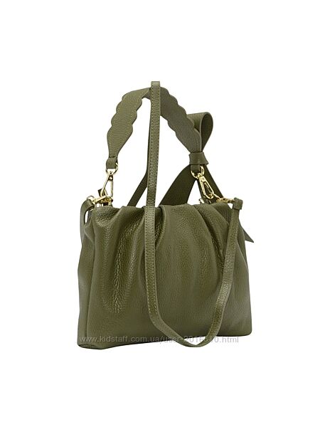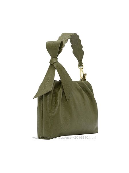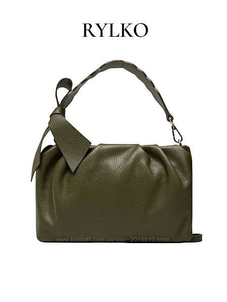 Кожаная женская сумка Rylko. Новая.Элегантная сумочка RYŁKO оливкового цвета с кожаным декоративным бантом на ручке. Выполнена из лицевой кожи высокого качества, с застежкой-молнии. Сумка маленькая, не вмещает формат A4. Модель оснащена 1 внутренним отделом и 1 маленьким карманчиком внутри на молнии, а также регулируемый ремень на плечо -максимальная длина 120 см. Стильная и очень удобная ручка, высотой 17 см. Размеры: Высота: 18 см, Ширина: 26 см, Глубина- 5см