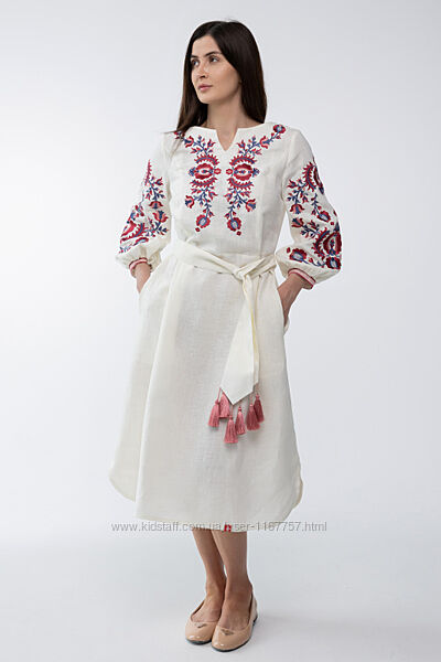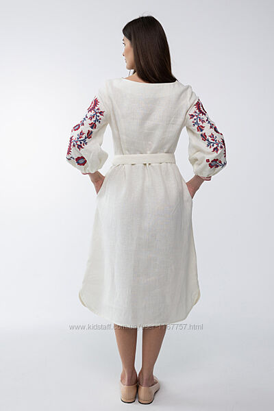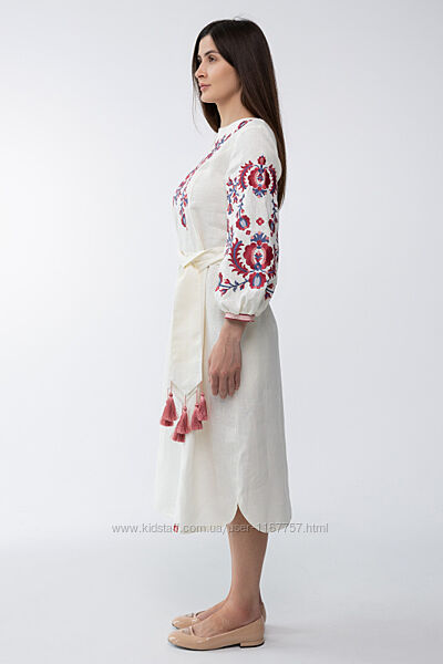 Елегантна вишита сукня жіноча з натурального льону має унікальний орнамент козацької доби, періоду XVII-XVIII століття. Характерною ознакою вишивки того часу є переважаюче використання рослинного орнаменту. Пошита сукня з натурального льону вершкового кольору, на рукавах і верхній частині переду має складний рослинний орнамент, виконаний із ниток бордового, пудрового та синього кольору в техніці двобічна гладь.Запозичивши частково культурні традиції, де в XVII-XVIII ст. була досить популярна рослинна орнаментика, освоївши деякі техніки виконання та адаптувавши цей новий пласт до місцевих звичаїв, були створені унікальні орнаменти. Саме ґрунтовними дослідженнями вишивки того часу надихались майстри при створенні даної моделі. Завдяки цьому плаття-вишиванка вигідно відрізняється від інших виробів, воно виглядає ошатно, дуже ніжно й елегантно.