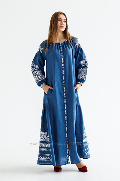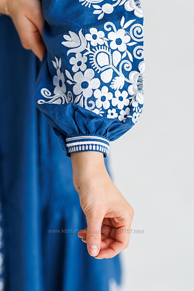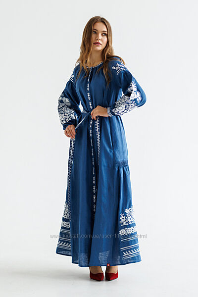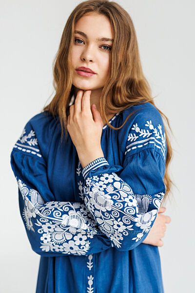 Довга сукня-вишиванка зачарує й закохає у себе своєю елегантністю, витонченістю, що вдало поєднуються з комфортом і практичністю експлуатації. Проте головна перевага даної моделі – її автентичність, запозичення для орнаменту древньої символіки наших предків, що несе потужну енергетику. Центральний мотив вишивки – Дерево життя або Світове дерево. Це популярний жіночий символ наших предків, що відображає зв´язок між небом, землею та підземним світом, символізує родинний зв´язок, гармонію, неперервність життя. Здавна він використовується в українській культурі як оберіг, вираження духовності й віри.Інтернет-магазин пропонує купити плаття вишиванку синього кольору зі складним орнаментом, що виконано у різних техніках. Тут застосовано техніку полтавської двобічної та гаптованої гладі, рушникові шви, стрічка і стебельчатий шов, качалочка. Матеріал виконання – натуральний льон, що є дуже приємним до тіла. Він не парить, дозволяє шкірі дихати.