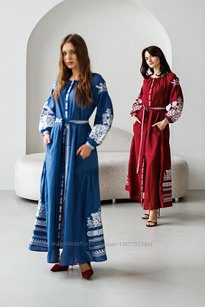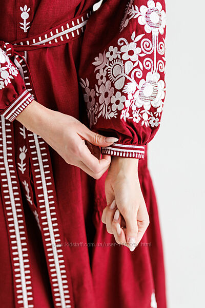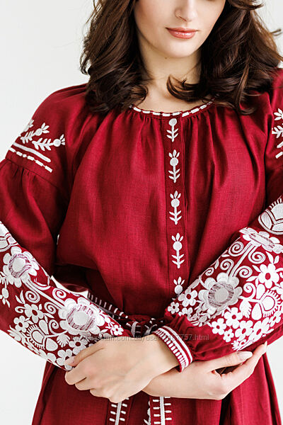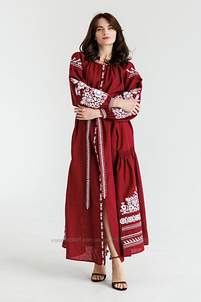 Неординарне плаття максі пошите з натуральної лляної тканини бордового кольору, що є м’якою, приємною до тіла. Матеріал не парить, відмінно пропускає повітря і вбирає зайву вологу. При створенні орнаменту застосовано техніку полтавської двобічної та гаптованої гладі, рушникові шви, стрічка і стебельчатий шов, качалочка.