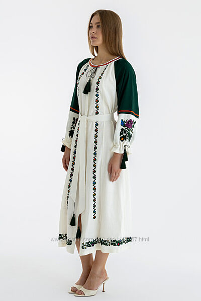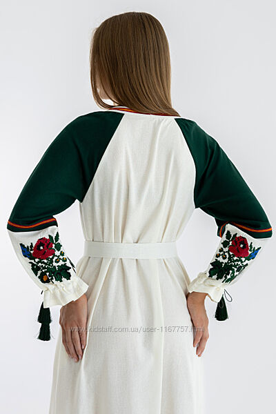 Неперевершена лляна сукня вишиванка жіноча міді довжини має автентичний орнамент за мотивами стародавньої вишивки кінця ХІХ – поч. ХХ ст. Модель привертає увагу незвичним кольором основи – вершковим, та оригінальною різноколірною рослинною вишивкою на рукавах, подолі та вздовж передньої частини. На увагу заслуговує довгий рукав-реглан, який складається з двох частин зеленого і вершкового кольору.Плаття заслуговує на увагу з багатьох причин, у тому числі й тому, що вишивка внесена до переліку нематеріальної культурної спадщини України.