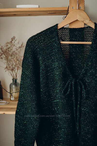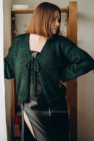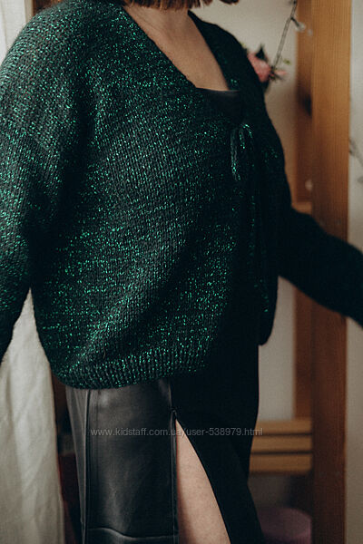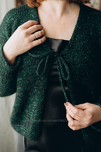 Блискуча кофтина на зав´язках, чудовий варіант для новорічного вбрання) Ширина 56 см. Довжина 54 см., що ідеально Під сукню або спідницю. Рукав 69 см. від горла. Склад: мохер/меринос + ниточка віскозного люрексу.