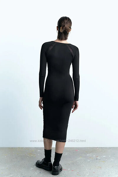 Чорна обтисла сукня Zara дуже сексуальна .З довгими рукавами має виразну бічну вставку з імітацією рваного або розсіченого трикотажу, яка додає образу текстури та акценту.
