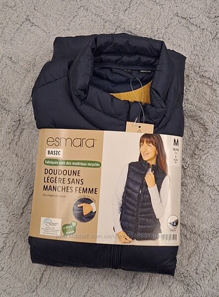 Жіночий зручний та стильний, стьобаний жилет від бренду Esmara. Наповнювач із поліестеру. Вітро- і водонепроникний.З екологічно нешкідливим просоченням. Водовідштовхуючий матеріал завдяки обробці BIONIC-FINISH® ECO. З коміром-стійкою, блискавкою та захистом підборіддя. Бічні кишені.