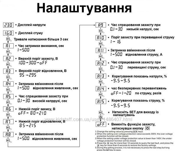 - Діапазон напруги відновлення після перенапруги: 95-295 В (за замовчуванням: 265 В).