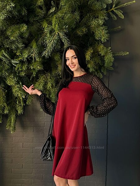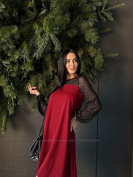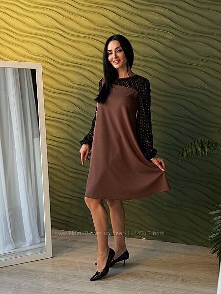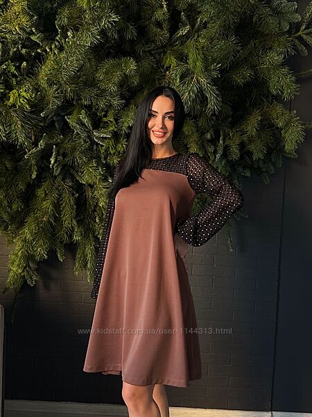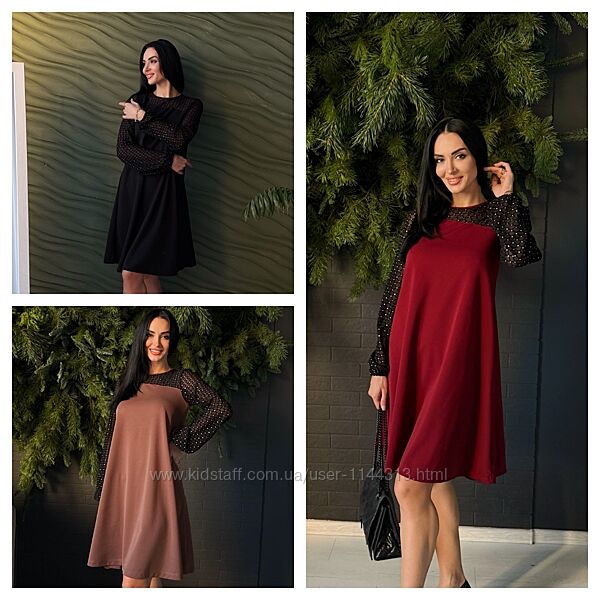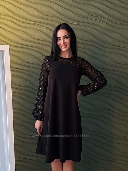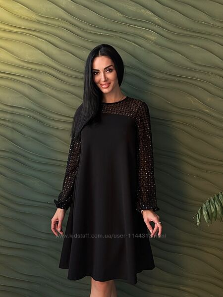 Вечірня сукня з прозорими рукавами — це елегантний вибір для святкових подій, корпоративів, ресторанних виходів чи походів до театру. Поєднання креп дайвінгу та прозорої сіточки з блискітками створює оригінальний контраст, завдяки якому модель виглядає вишукано та одразу привертає увагу.Трапецієподібний вільний крій м’яко окреслює фігуру та гарантує комфорт, а довгі рукави з блискучої сіточки додають образу святковості й особливого шарму. У цій моделі ви почуватиметеся впевнено та виглядатимете карколомно.