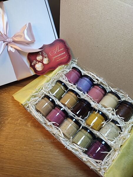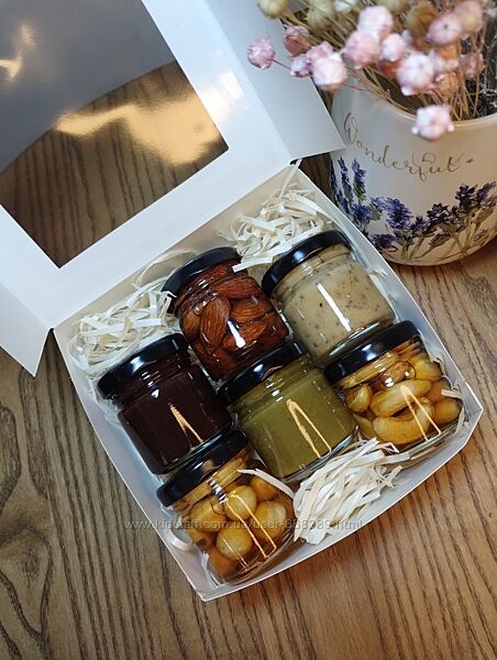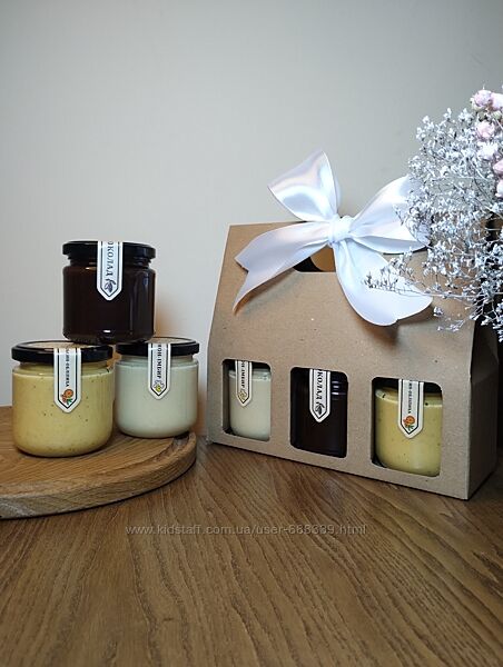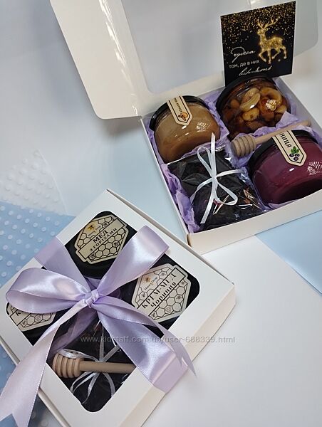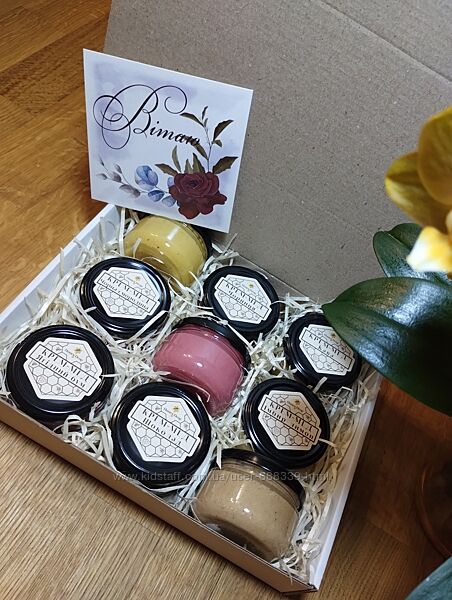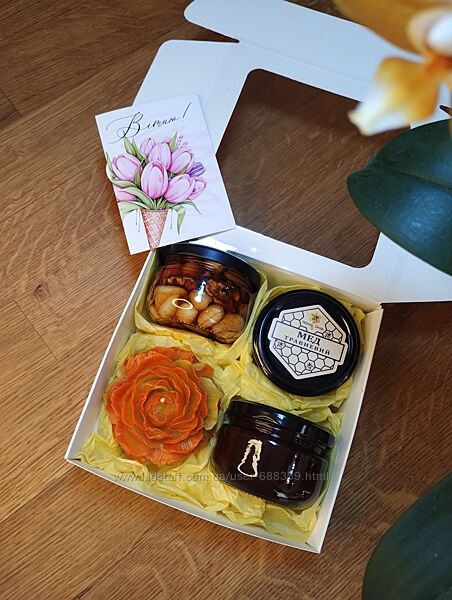 Фото 1 ціна 720 грнНабір крем-меду у білій подарунковій коробці зі стрічкою і листівкою на вибір