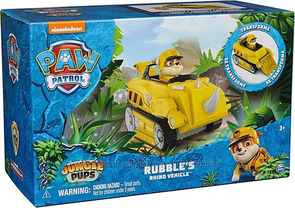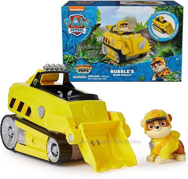 Ігровий набір з фігуркою Реббл і його рино-машиною з серії Jungle Pups. Яскравий дизайн, рухомі елементи та неймовірні пригоди у джунглях разом із улюбленими героями Щенячого патруля!Герої знову вирушають у джунглі! Познайомтеся з новим ігровим набором Paw Patrol Jungle Pups Rubble Rhino — улюблений будівельник Реббл отримав новий транспорт у вигляді потужного носорога!