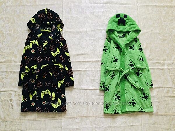 6-7 рок., Плейстейшн та Майнкрафт флісовий, махровий, пухнастий халат. Теплий, банний на море або в басейн. Стан: нового, слідів носки немає. зав´язуються на талії пояском, є кишені.Плейстейшн довжина 66; рукав від вороту 47 ціна 199