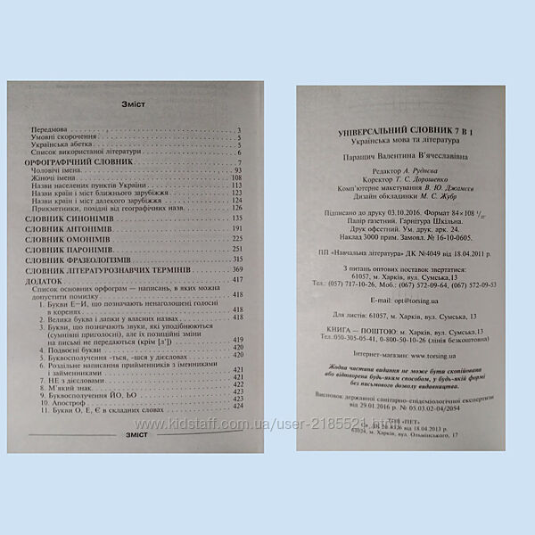 Запропонований універсальний словник з української мови та літератури містить словники: орфографічний, синонімів, антонімів, паронімів,фразеологізмів та літературознавчих термінів в достатньому обсязі.