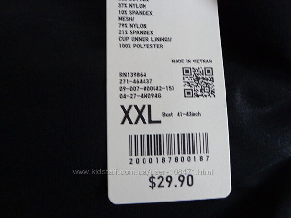 Верхня частина: 53% бавовна, 37% нейлон, 10% спандекс / Сітка: 79% нейлон, 21% спандекс / Чашечка (підкладка): 100% поліестер