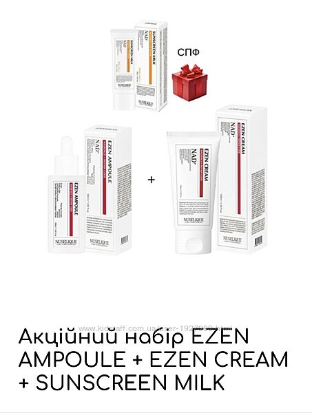 Акційний набір NUSELIQUE EZEN AMPOULE + EZEN CREAM + SUNSCREEN MILKВ наборі є три засоби: