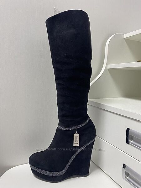 Подробное описание: Чорні замшеві чоботи європейка на танкетці Kelton