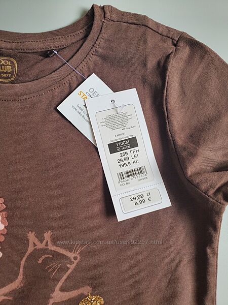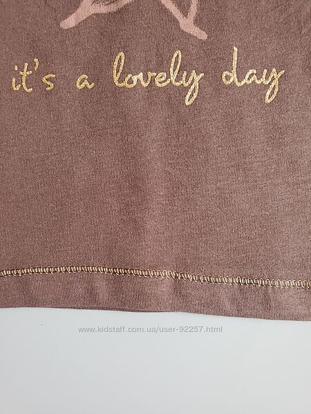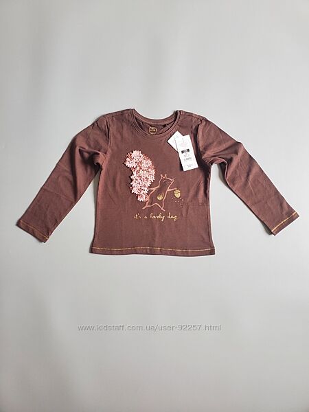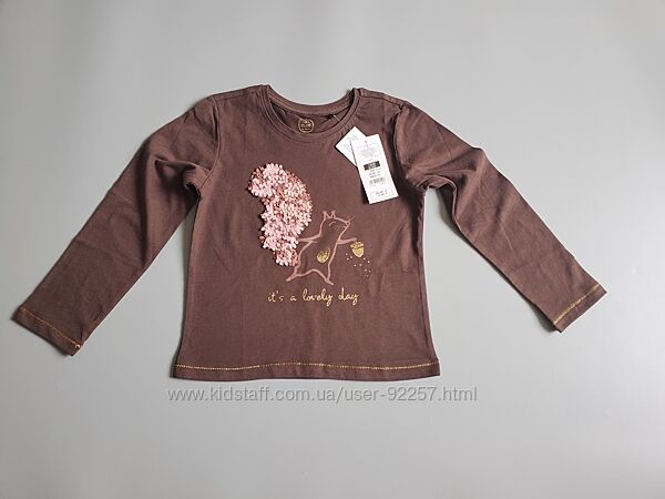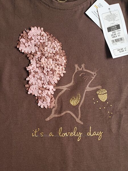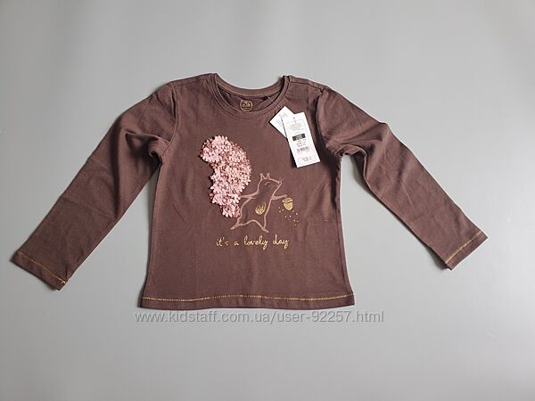 Продається новий дитячий лонгслів коричневого кольору. Розмір: 110 см Матеріал: 100% бавовна. Декор: об´ємне вишиття у формі білочки з квітковими елементами. Напис: "It´s a lovely day". Ціна: 200 грн
