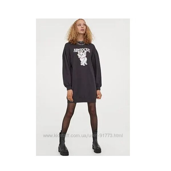 Сукня трикотажна H&M Disney розмір S, або р.158/164. Стан нової. Колір: темно-сірий. Склад: 70% - бавовни, 30% - поліестер.Заміри: ширина плечей - 50 см, довжина рукава- 52 см, півобхват грудей - 51,5 см, півобхват талії - 52 см, довжина - 82 см