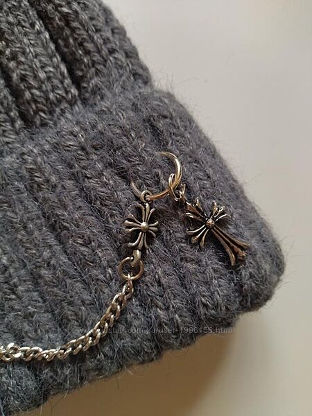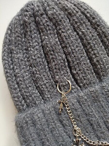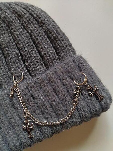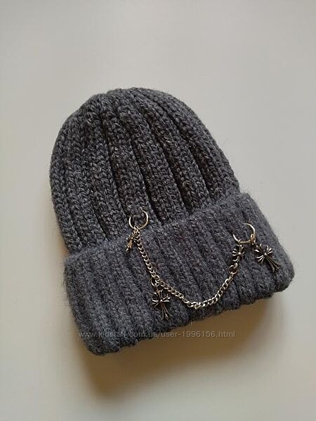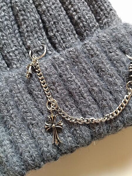Шапочки нові, без паперових етикеток (не секонд), з підворотом, велика в´язка, спереду з прикрасою. Початок та кінець ланцюжка кріпиться до шапки, вся решта ланцюжка вільно спадає. Склад та розмір не вказано, тягнеться. Верх шапочки середньої щільності, підворот має доволі хорошу щільність.