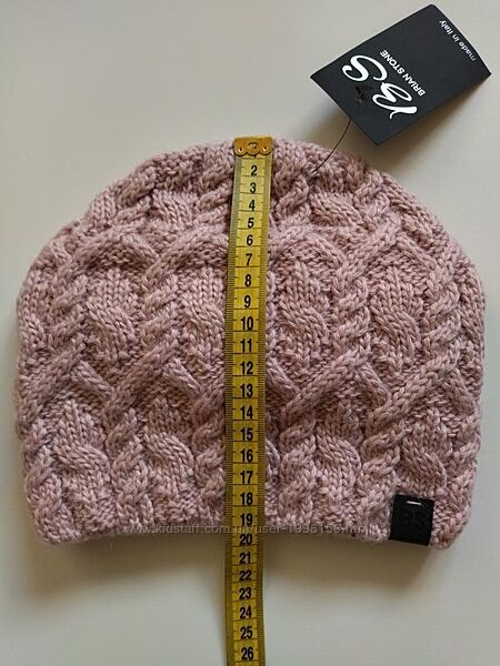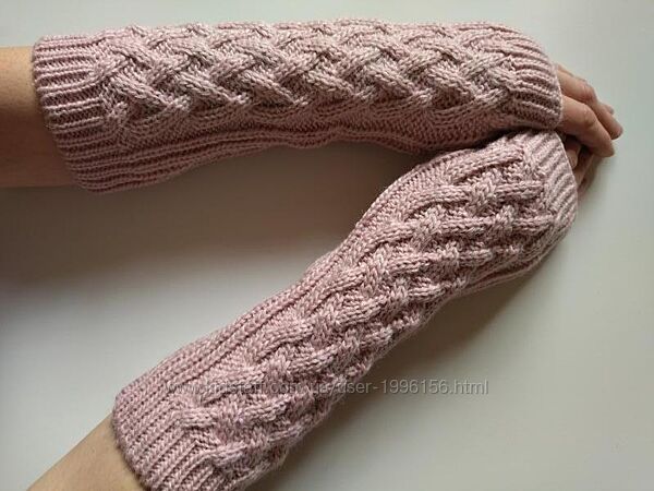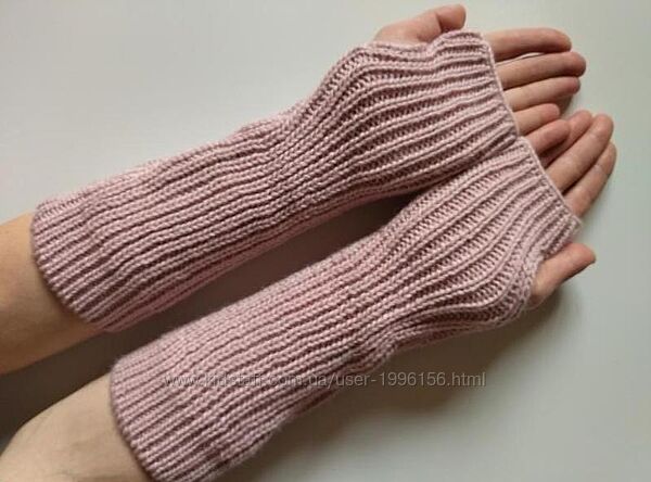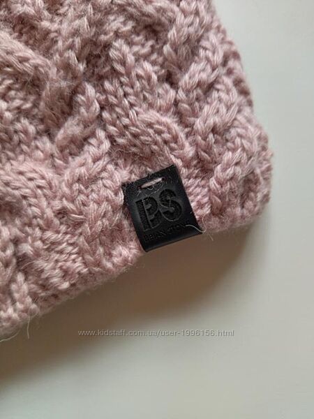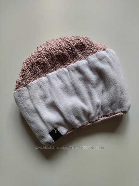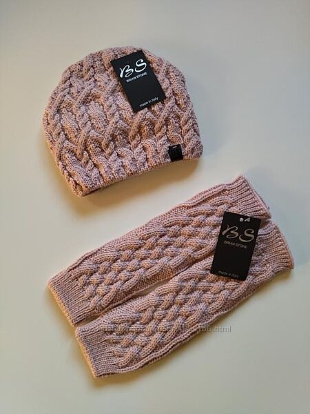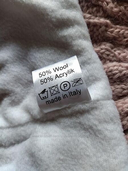 В´язана шапочка, не сильно щільна, верхівка ззаду пришита. Спереду внизу пришито логотип фірми виробника, з виворітного боку, до середини шапочки, підкладка на флісі (на останньому фото шапка вивернута навиворіт). Колір рожевий (пудра). Склад: 50% вовна, 50% акрил, трохи тягнеться. Розмір не вказано, орієнтуйтесь на заміри. Мітенки (рукавиці без пальців), довжина: 31-32 см.