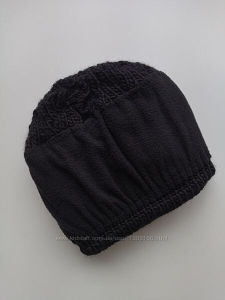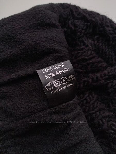 В´язана шапочка, верхівка ззаду пришита. З виворітного боку, до середини шапочки, підкладка на флісі (на останньому фото шапка вивернута навиворіт). Верх шапочки не сильно щільний, до низу щільність більш вища. Склад: 50% вовна, 50% акрил, трохи тягнеться. Розмір не вказано.