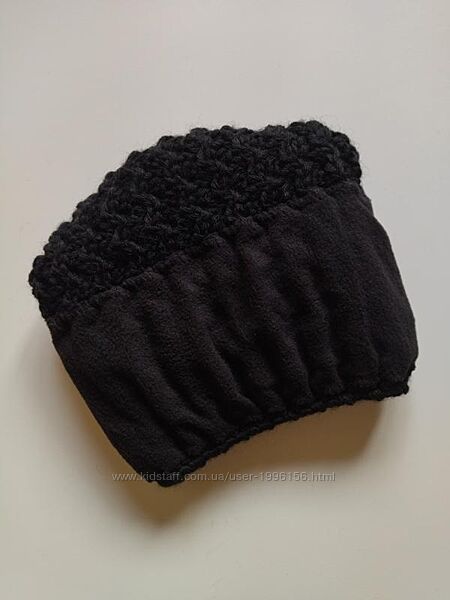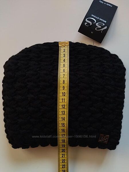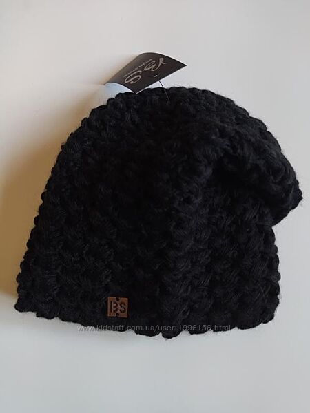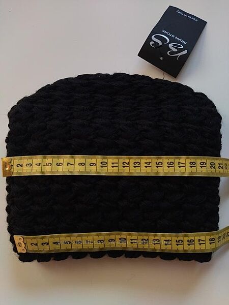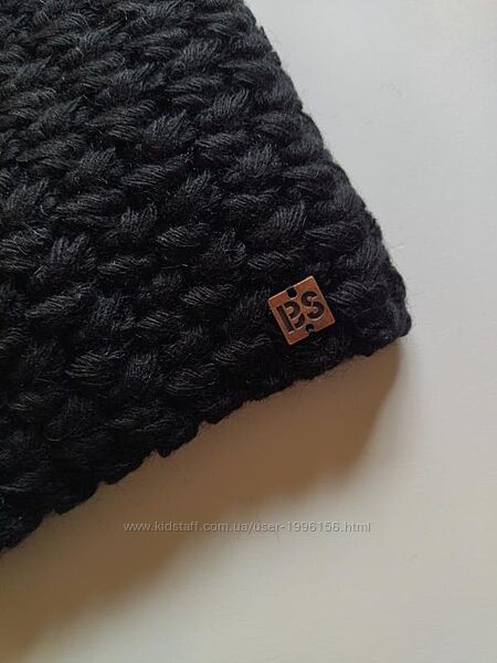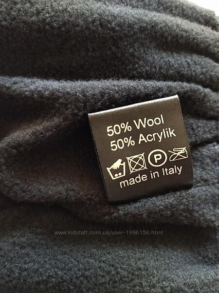 В´язана шапочка, верхівка ззаду пришита. Спереду внизу пришито логотип фірми виробника, з виворітного боку, до середини шапочки, підкладка на флісі (на останньому фото шапка вивернута навиворіт). Верх шапочки не сильно щільний, до низу щільність більш вища. Склад: 50% вовна, 50% акрил, трохи тягнеться. Розмір не вказано.
