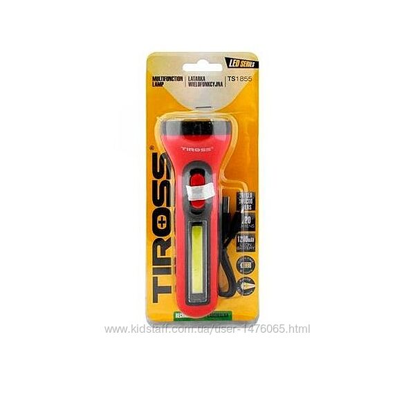 TirossTS1855 — компактний акумуляторний ліхтар з двома джерелами світла: потужнимфронтальним LED та боковим COB для роботи зблизька. Має вбудований акумулятор