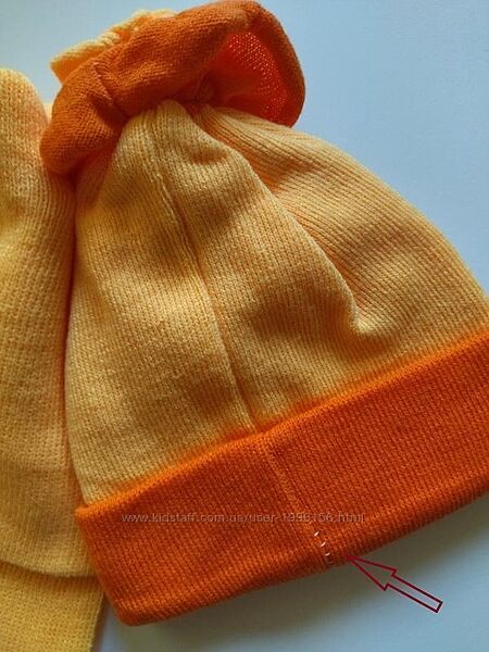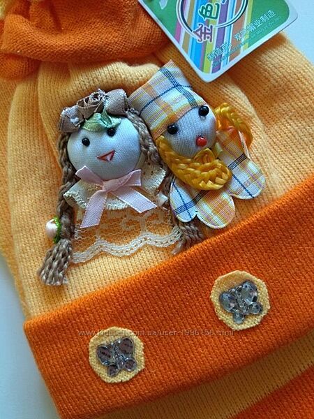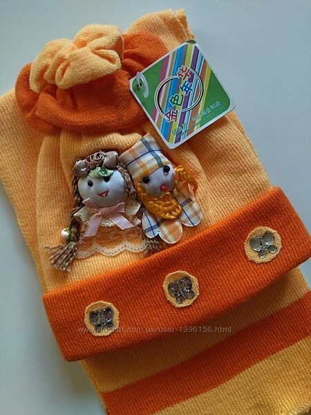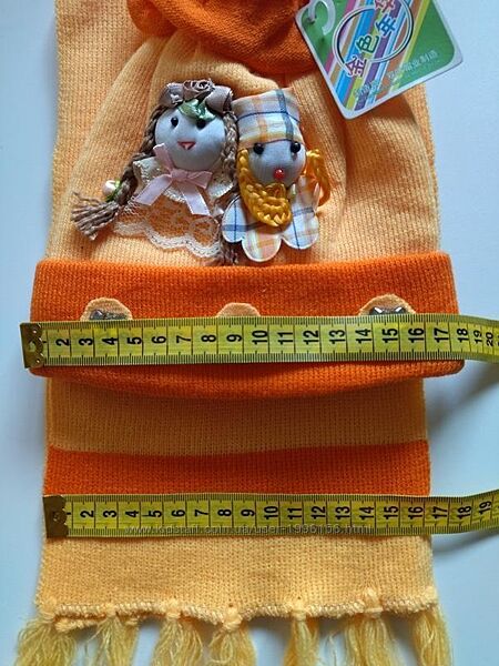 Є нюанс ззаду на шапочці, все прошито але видно ниточки (показано на останньому фото). Шапочка двошарова, спереду приклеєні прикраси - метелики та ляльки. Шарфик тонкий, його довжина - 90/92 см без урахування бахроми, довжина бахроми 10/11 см (тканина тягнеться, допустима невелика похибка). Заміри зняті в спокійному (нерозтягнутому) стані. Склад та розмір, на жаль, не вказано.