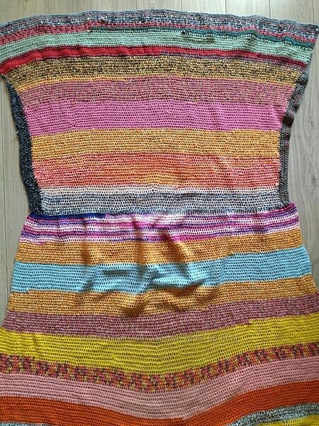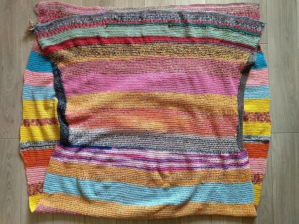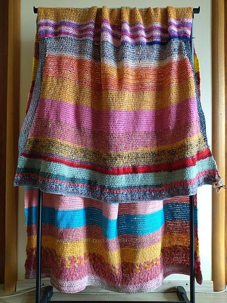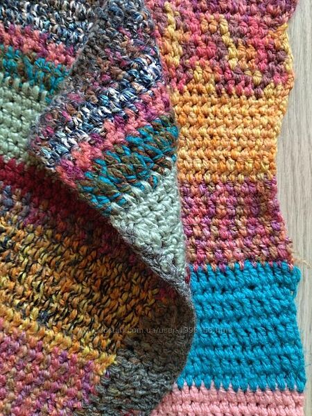 В´язане велике покривало на крісло ручної роботи. В´язане по формі крісла. Спинка зверху широченька і поступово звужується до сидіння, далі велика широка частина. Заміри можуть трішки відрізнятися +/- декілька сантиметрів, так як полотно велике і тягнеться. Пряжа різнокольорова, складу не знаю.