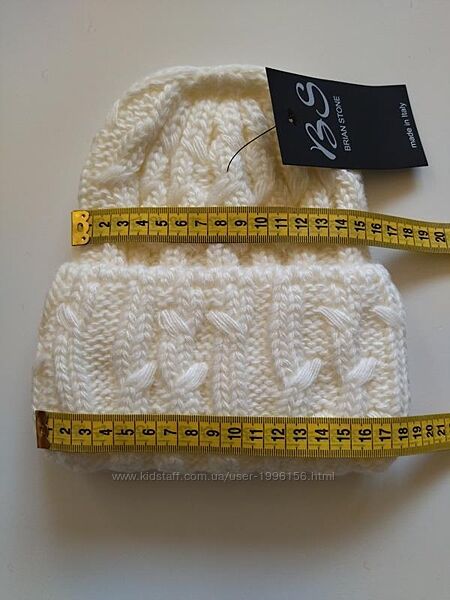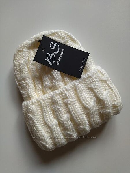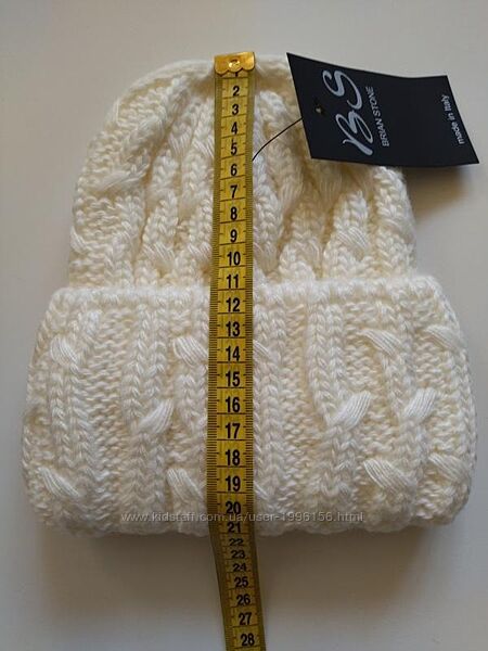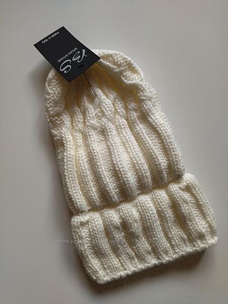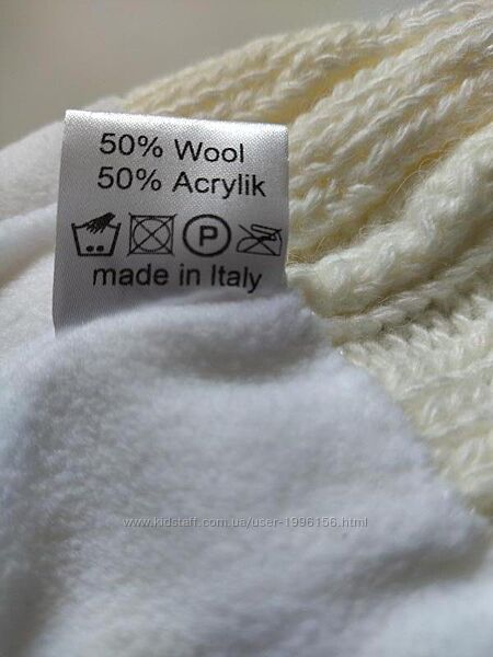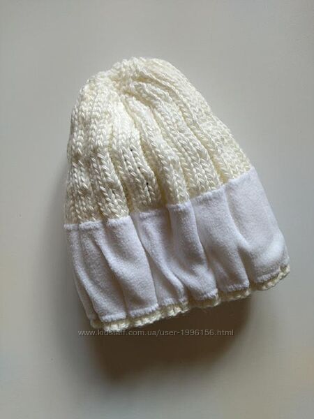 Шапка великої в´язки з підворотом, колір не білосніжний, а трохи кремовий. Верх шапочки не сильно щільний, до низу щільність більш вища. Склад: 50% вовна, 50% акрил, трохи тягнеться. Розмір не вказано.