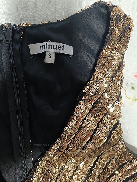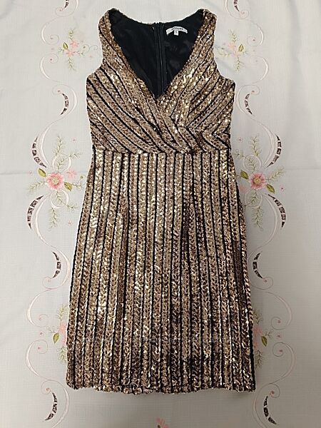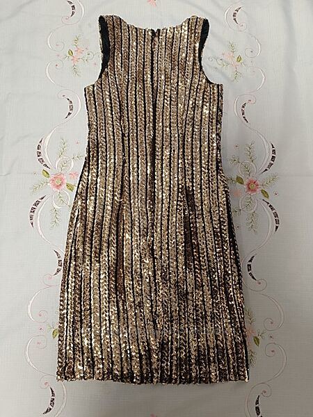 Красиве блискуче плаття в золотому кольорі. Розмір S Заміри ПОГ 35 см тягнеться до 45 см ( на груди 90 см підійде) Довжина по спинці 81 см ПОТ 32 см Має підкладку, блискітки всі на місці, тримаються міцно, тканина тягнеться. Стан відмінний. Відправка НП після оплати на картку