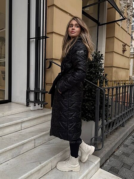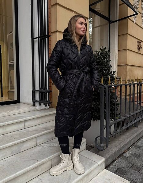 Пальто на замочку. На кишенях також замочки. Є капюшон, пояс. На рукаві є нашивка