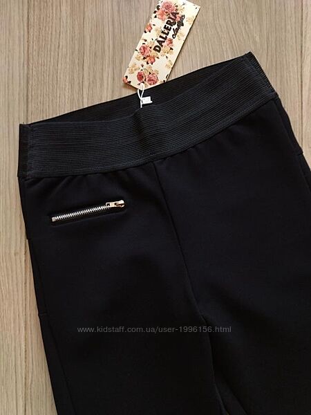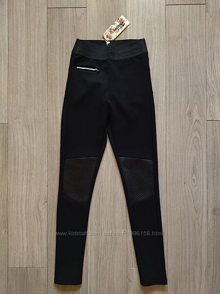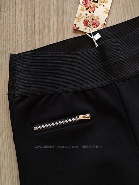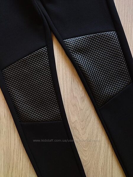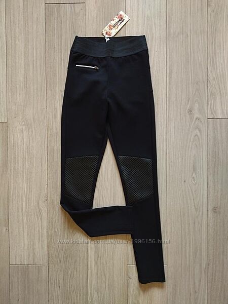 Пояс на широкій резинці. Спереду декор - блискавка, на колінах вставочки (вставочки з тканини схожої на плащову чи замінник шкіри, що це достовірно не знаю). Тканина не тонесенька, цупка, тягнеться не сильно. Бірки зі складом, на жаль, немає. Розмір вказано S, можуть маломірити. Весь одяг зберігається у складеному вигляді, потрібно буде відпарити чи прогладити (якщо це передбачено виробником).