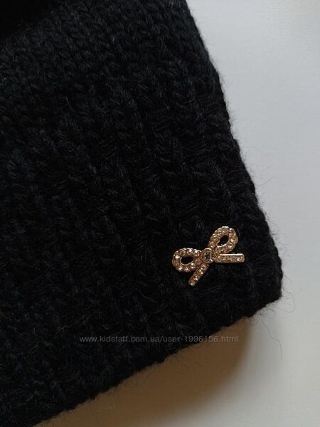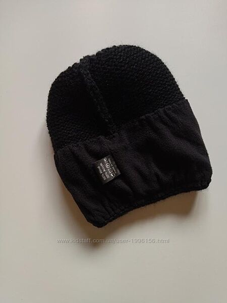 Шапочка зверху з помпоном, верх не сильно щільний, низ біля вушок трохи щільніший, знизу прикріплена прикраса. З виворітного боку, до середини шапочки, підкладка на флісі (на останньому фото шапка вивернута навиворіт). Склад: 50% шерсть, 50% акрил, трохи тягнеться. Розмір не вказано.