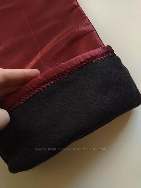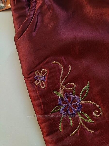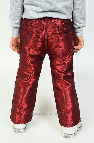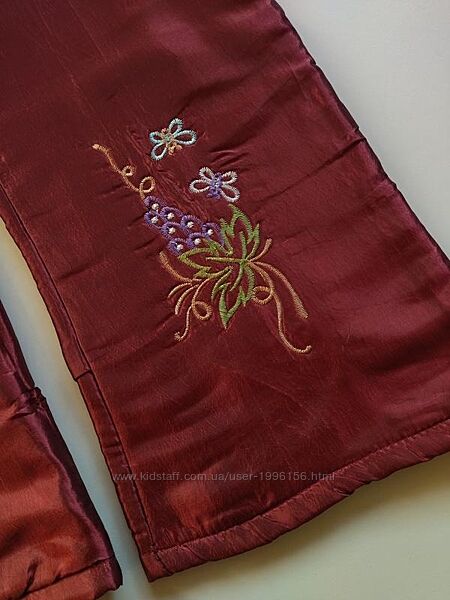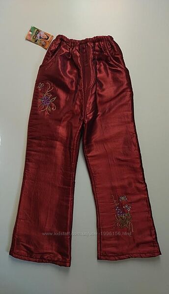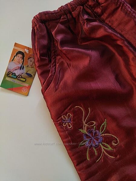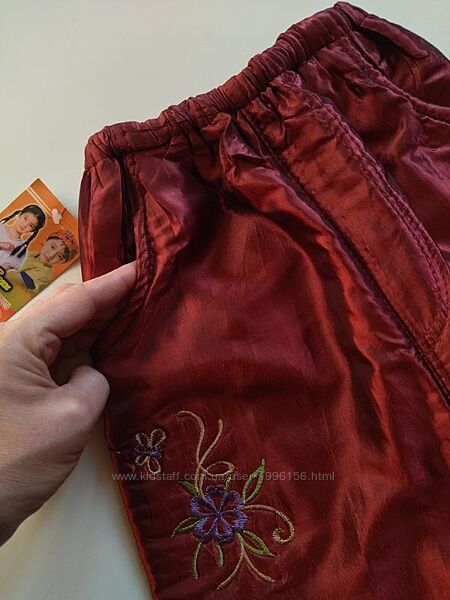 Пояс на резинці. Спереду дві кишені та одна кишеня ззаду. На штанинах вишивка. Штанішки з гладенькою поверхнею з блиском (скоріш за все поліестер), всередині на флісі. Склад, на жаль, не вказано, тканина не тягнеться, щільна. Брючки теплі.
