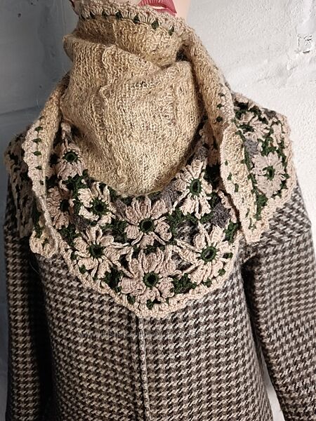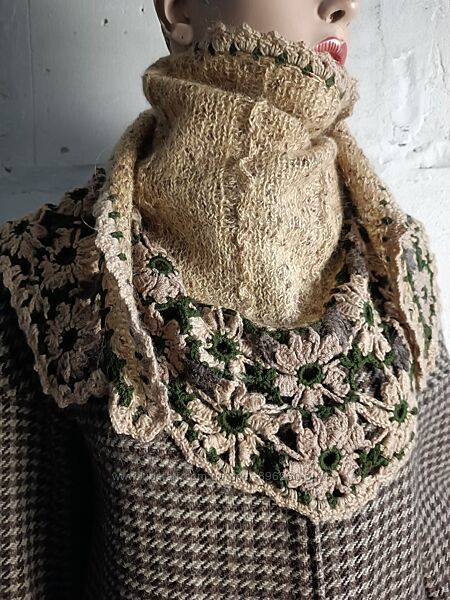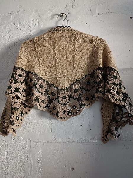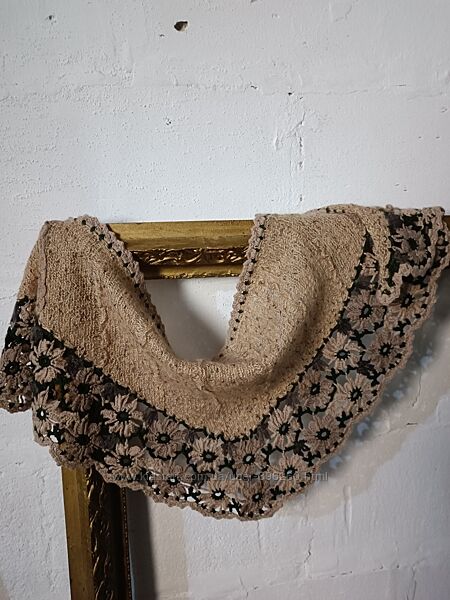 Шаль, хустина ручної роботи з якісних ниток, в бежевих кольорах, комбінація в´язка спицями і гачком (мережево і обв´язка). Розмір довдина 142 см, вершина трикутнику 48 см.Робіть свій вибір свідомо, повернення не передбачено.