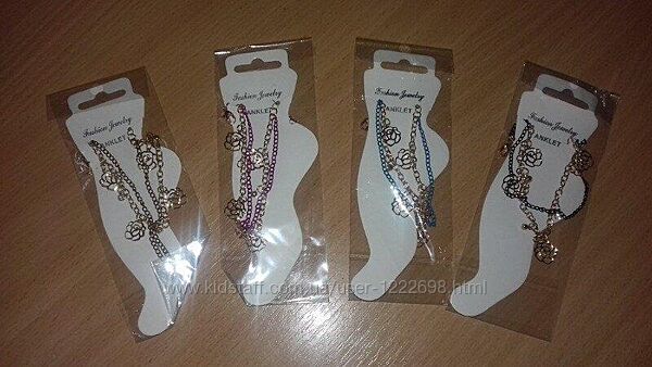 Браслеты на ногу металлические сделаны в виде двух цепочек к которым крепятся подвески в виде тибетской розы и кристаллов стразов. Длина браслета 22 сантимера . Для увеличения диаметра браслетов можно использовать дополнительные золотые панцирные цепочки. . Замок браслета шпрингельный. Ціна 26 гривень