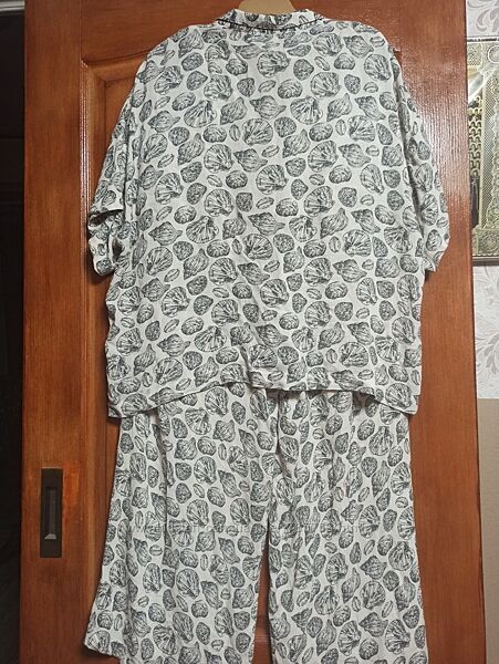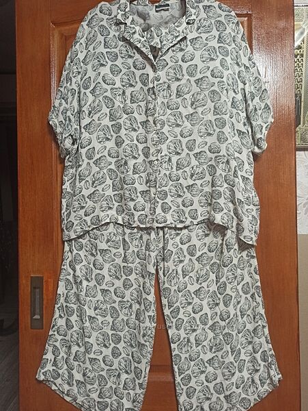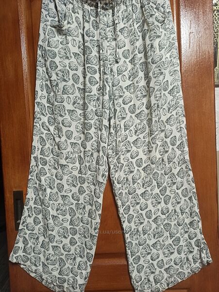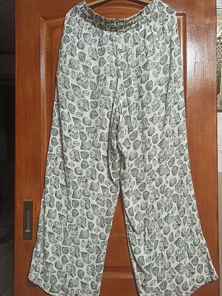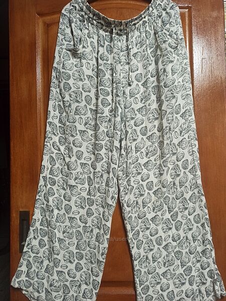 Костюм на літо. Дуже легкий, натуральна тканина, штани вільні, широкі, блузка трішки длініша за перед.Брюки-- ПІТ 45 см-- 57 см, ПІС 85 см, довжина 110/ 80 см, посадка 35 /46 см. По бокам є кишені. Є дефект. Між ногами є потертость, на фото показано, можна ізнутрі підшити тканину, дірки там немає. Вони довгі, на високий зріст, може кому довгі, то можна підрізати і цією тканиною підшити. Я б зробила так.