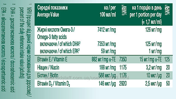 Не перевищуйте зазначену рекомендовану добову дозу. Продукти додаткового харчування не слід використовувати як заміну різноманітного та збалансованого харчування та здорового способу життя. Зберігайте продукт у недоступному для дітей місці. додаткового харчування містить жирні кислоти Omega 3, Вітамін E, Ніацин, Біотин, Вітамін D2. Смак: імбир-апельсин. 1 пляшка = 51 мл/ 30 порцій по 1,7 мл.