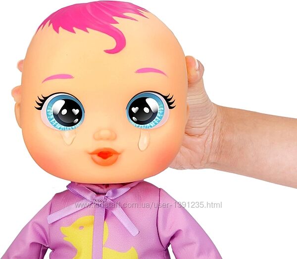 Новонароджена Зої від Cry Babies готова прийняти ванну у своїй ванній! Вона реагує на воду дитячими звуками! Сповийте її персоналізованим жовтим рушником у формі качки, щоб висушити. У комплект входить 6 аксесуарів. Вона плаче справжніми сльозами, коли ви натискаєте на її голівку.Зої любить купатися, коли ви кладете її у воду або вона намокає, вона реагує звуками.