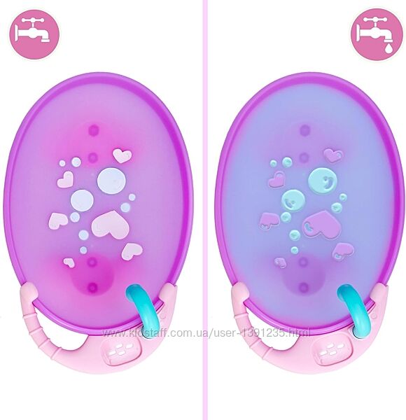 6 аксесуарів у комплекті: ванночка, персоналізований рушник, пустушка, гумова качечка, імітація мила та ополіскувач.